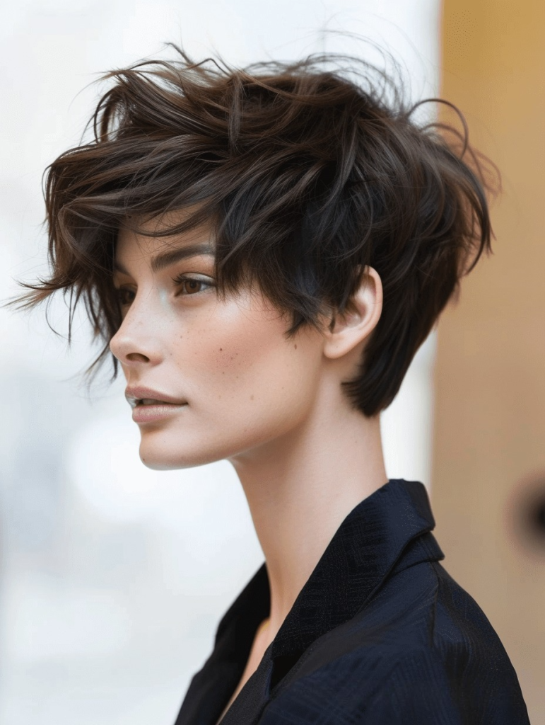 Hier sehen wir ein Meisterwerk aus Balance und Charakter mit einem schicken, asymmetrischen Schnitt, der durch einen strukturierten, geraden Pony aufgelockert wird. Dieser Style ist perfekt für Frauen, die die Kühnheit eines Kurzhaarschnitts mit der femininen Note eines Ponys kombinieren möchten. Die Asymmetrie passt hervorragend zu ovalen Gesichtern, und der gerade, strukturierte Pony verleiht ein modernes Flair, das sich mühelos vom Tag in den Abend verwandeln lässt.