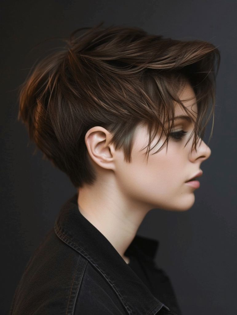 Dieser edgy Pixie-Schnitt mit seinen schwungvollen Stufen ist eine mutige Wahl und strahlt Selbstbewusstsein aus. Die längeren Stufen oben bilden einen Kontrast zu den kurzen, klaren Linien hinten und kreieren so eine raffinierte Silhouette, die zugleich modern und zeitlos ist. Dieser Stil schmeichelt besonders ovalen Gesichtern, da er die Symmetrie ihrer Gesichtszüge betont. Dieser Haarschnitt lässt sich zu vielen Looks kombinieren, von avantgardistisch bis dezent.