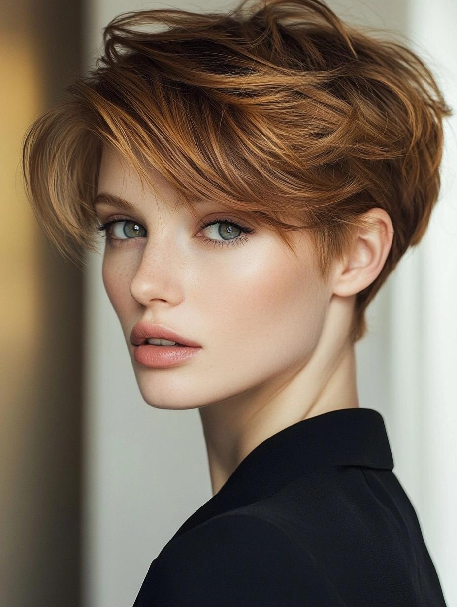 Dieser warme Kupferton und die sanften Wellen rahmen das Gesicht elegant ein und verleihen dem Schnitt eine feminine Note. Die dezenten Stufen sorgen für Volumen und Lebendigkeit. Ein Look, der hellen Hauttönen schmeichelt und die natürliche Schönheit unterstreicht.
