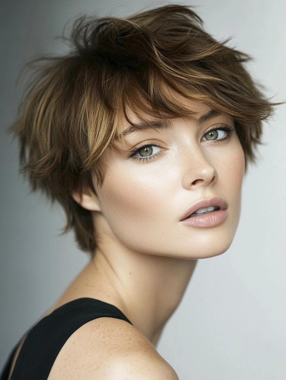 Der warme Braunton dieses Schnitts harmoniert perfekt mit der natürlichen Textur und den sanften Stufen, die Volumen verleihen. Diese moderne und zeitlose Frisur unterstreicht elegant Ihre natürliche Schönheit. Perfekt für Frauen, die einen schlichten und klaren Stil bevorzugen.