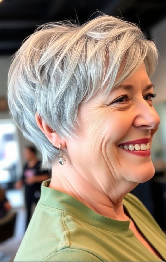 Frisch, schmeichelhaft und voller Struktur – dieser sanfte silberne Pixie-Schnitt verleiht Ihnen ein sicheres Gefühl. Der gestufte Oberkopf verleiht ihm Volumen und Form, während der schmal zulaufende Hinterkopf den Schnitt sauber und elegant wirken lässt. Es ist eine großartige Wahl, wenn Sie es lieben, ohne großen Aufwand gestylt auszusehen. Der kühle Silberton sorgt für Helligkeit und ergänzt natürliche Grautöne wunderbar, wodurch es mühelos modern wirkt. Dies ist einer dieser Styles, die zu jedem Anlass passen – pflegeleicht, aber trotzdem so, als kämen Sie frisch vom Friseur.