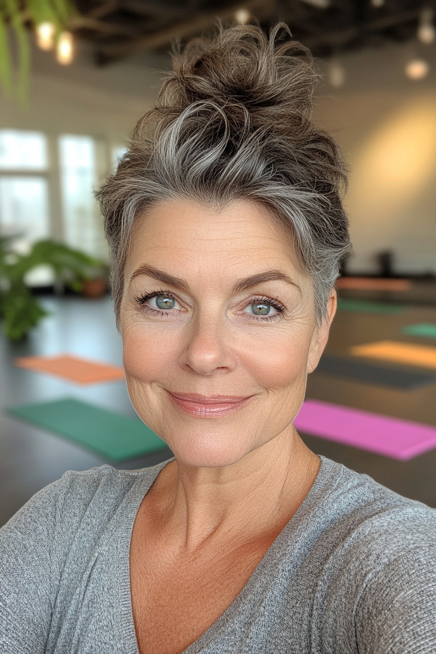 Der vorwärts gestylte Pixie-Schnitt ist ein einzigartiger Ansatz, der die Gesichtszüge in den Mittelpunkt rückt. Bei diesem Schnitt sind die Haare hinten und an den Seiten kürzer, während die längeren Strähnen oben nach vorne gestylt werden. Das sorgt für ein frisches und jugendliches Aussehen und verleiht gleichzeitig einen Hauch von Eleganz. Perfekt für den Alltag, kann er mit Volumenprodukten für zusätzlichen Flair aufgepeppt werden.