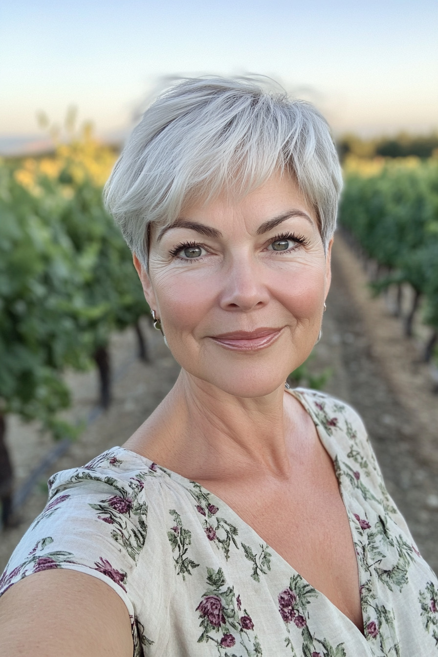 Die Bronde Kurzhaarfrisur kombiniert Blond- und Brauntöne und sorgt für einen warmen, sonnengeküssten Look. Diese dezente Färbetechnik verleiht Ihrem Haar Dimension und Lebendigkeit und eignet sich perfekt zum Betonen weicher Locken oder Wellen. Die kurze Länge ermöglicht ein einfaches Styling und bringt die wunderschöne Farbmischung optimal zur Geltung. Sie ist eine ausgezeichnete Wahl für Frauen, die einen frischen, modernen Touch wünschen, ohne sich auf einen einzigen Farbton festlegen zu müssen.